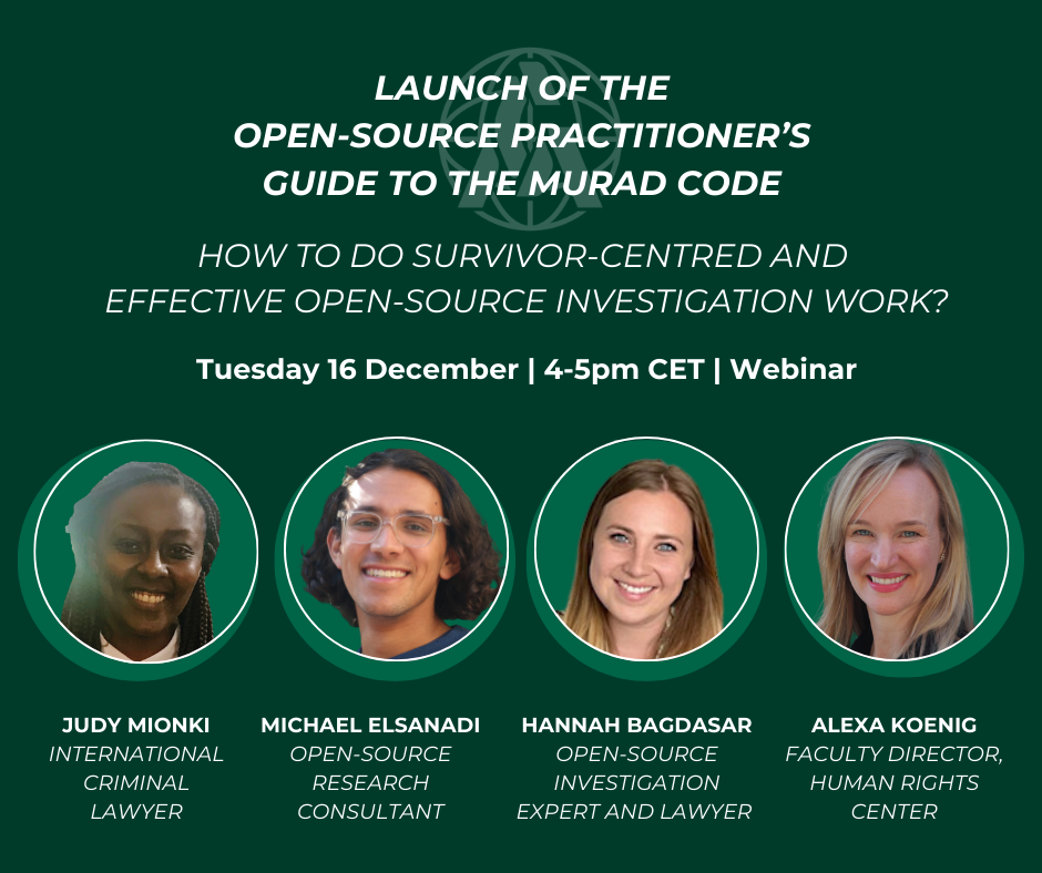 This webinar was held to launch the Open-Source Practitioner’s Guide to the Murad Code. Developed with leading experts, practitioners, and survivors, the Guide provides actionable protocols for investigators, researchers, journalists, analysts, and civil society organisations who may - intentionally or otherwise - encounter material related to sexual violence while working with open-source information in conflict and human rights contexts. The webinar features presentations from leading experts on how to apply the guidance in practice to ensure a survivor-centred and effective approach to open-source investigation work.